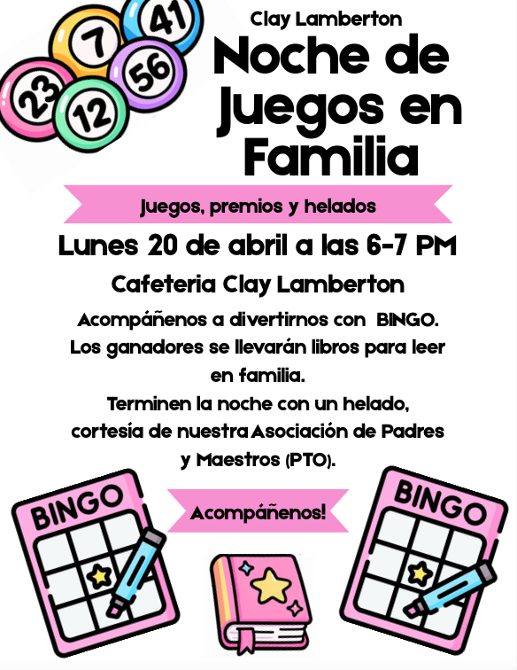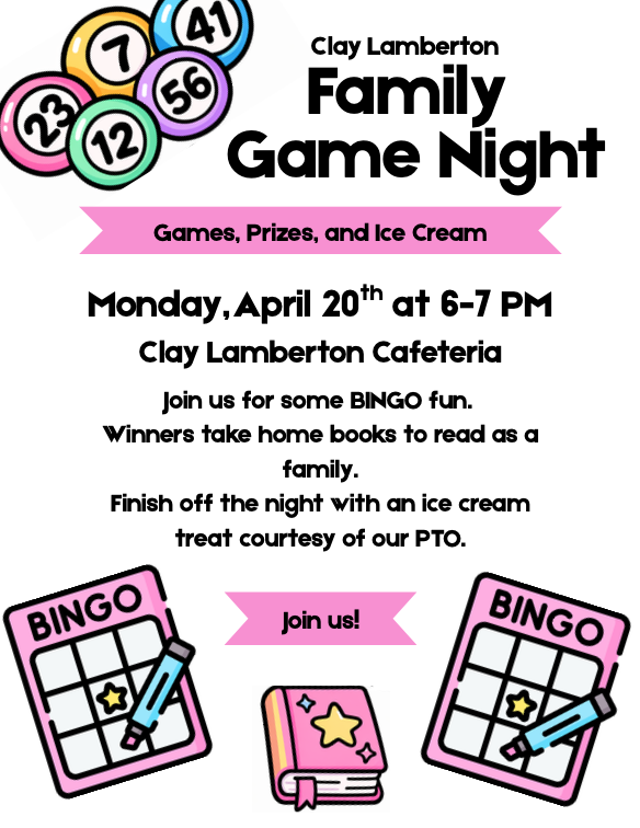 • April 20 | Family Bingo Night | 6 PM in Clay Cafeteria