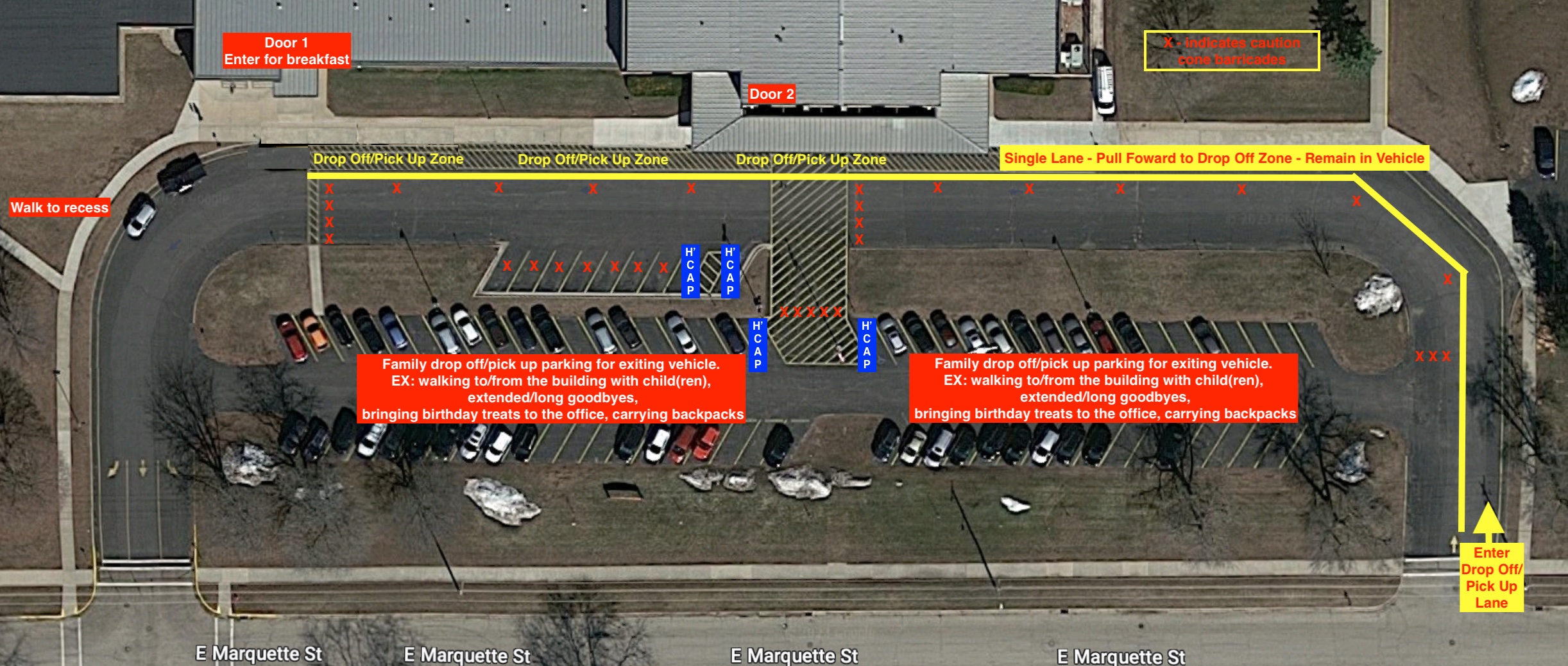 4K Drop-Off: All 4K students that do not arrive to school on the bus will enter Door 1 and go to the cafeteria in the morning. Please park in the front lot and walk your child to the crosswalk by Door 1.