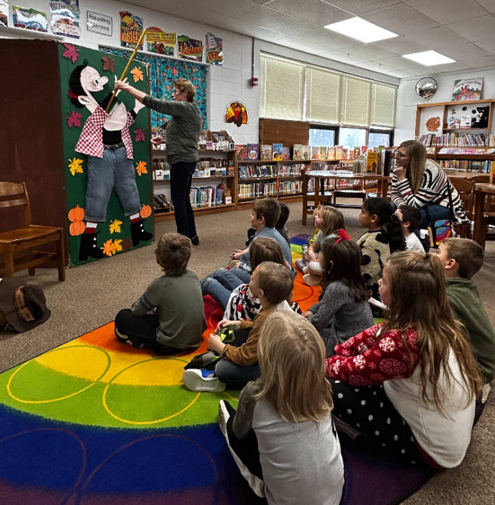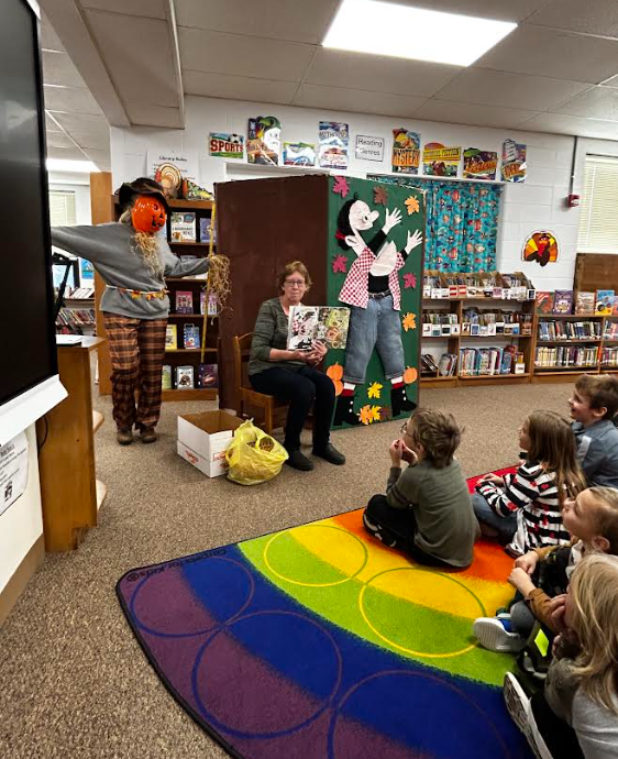 Giggles filled the library as the children listened to "There Was an Old Lady Who Swallowed Some Leaves." The real surprise came when Mrs. Johnson appeared, hilariously dressed in everything the old lady had swallowed! |
