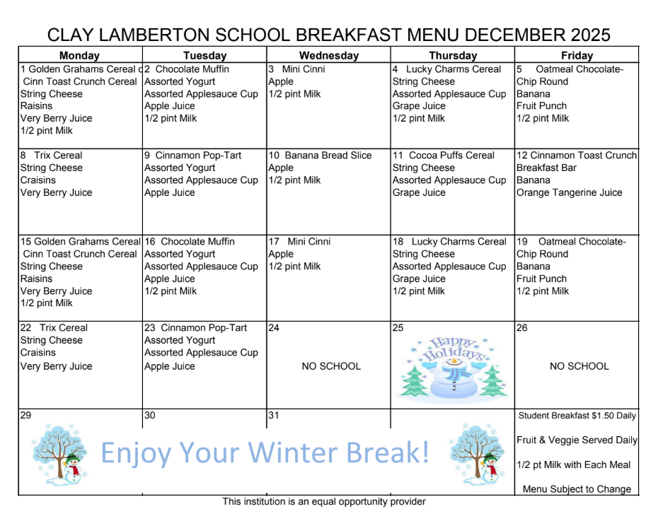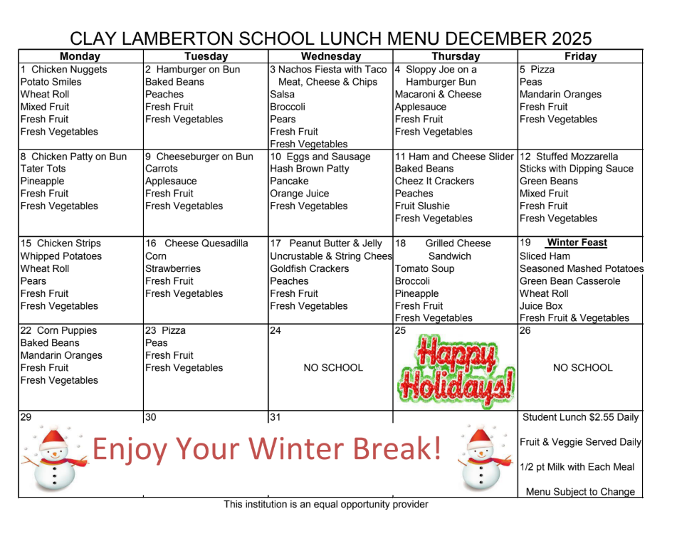 • Tuesday, December 9 | Clay PTO Meeting | 5 PM PLC Room