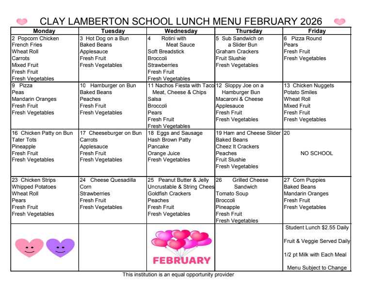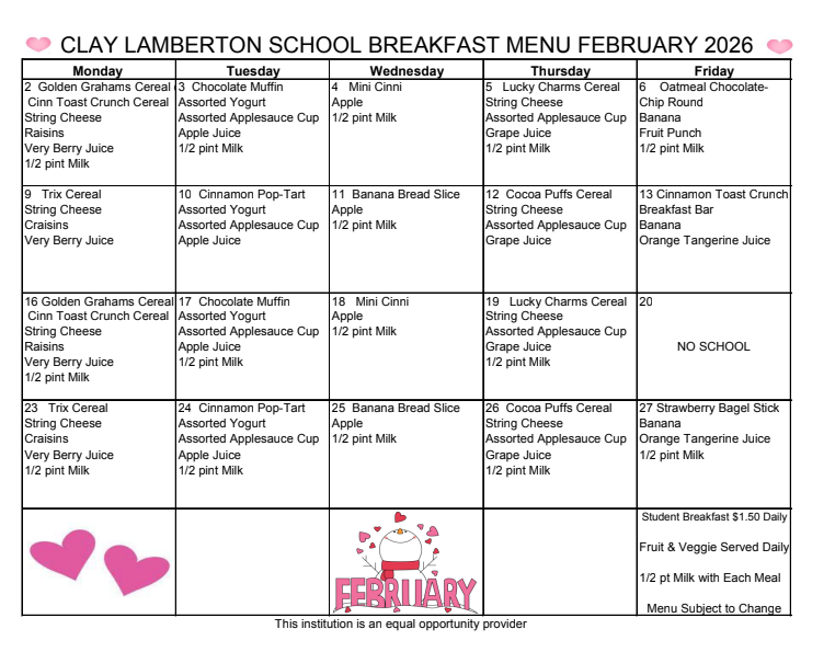 • Tuesday, Feb 10 | Clay Lamberton PTO Meeting | 5 PM • Wednesday, Feb 11 | Cub Connections | 8:30 AM • Monday, Feb 16 | The Anxious Generation Book Study, Chapters 7-9 | 6 PM