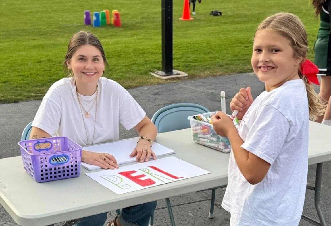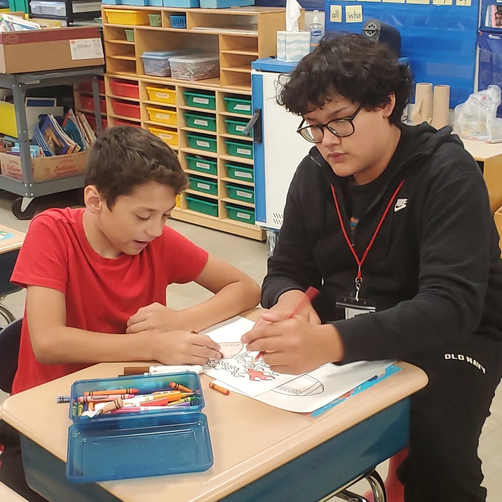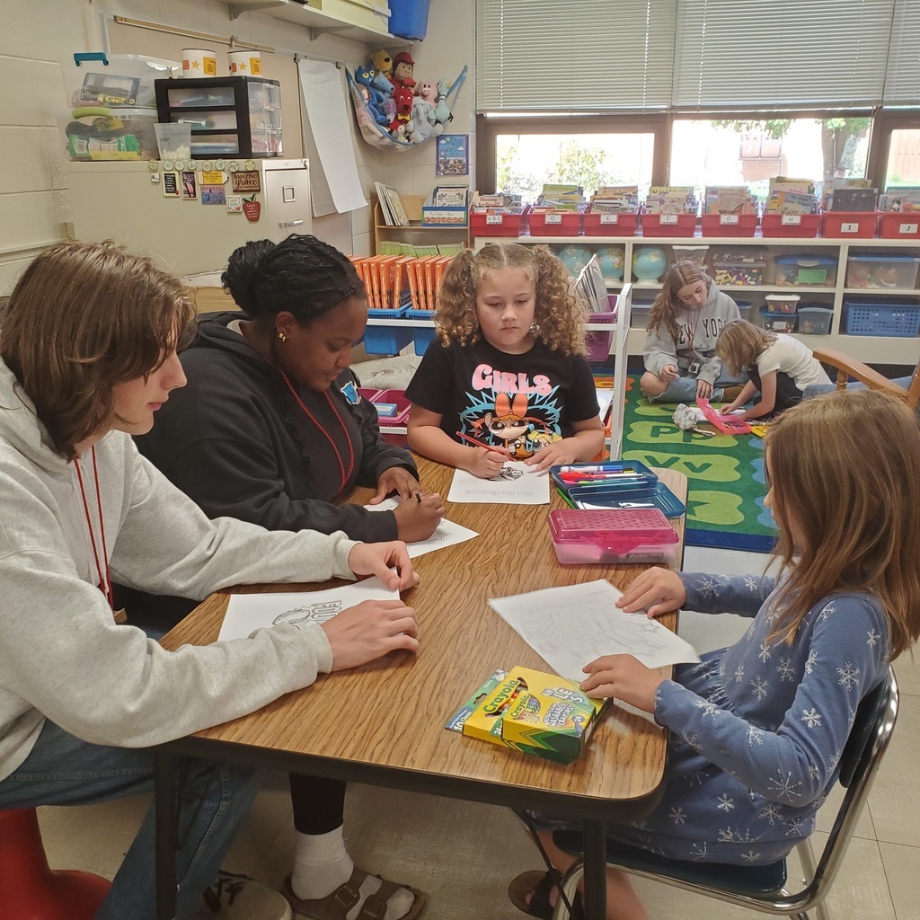 Mrs. Daubner's high school class visits every week to team up with the students in Mrs. Goettl's class. Recently, they had a blast making colorful Homecoming signs for the football team! The "big kids" loved them!