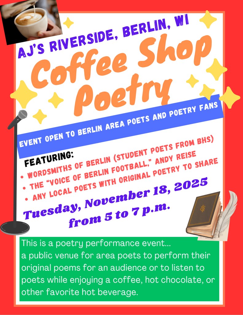 November 18 | Coffee Shop Poetry | AJ's Riverside | 5 PM