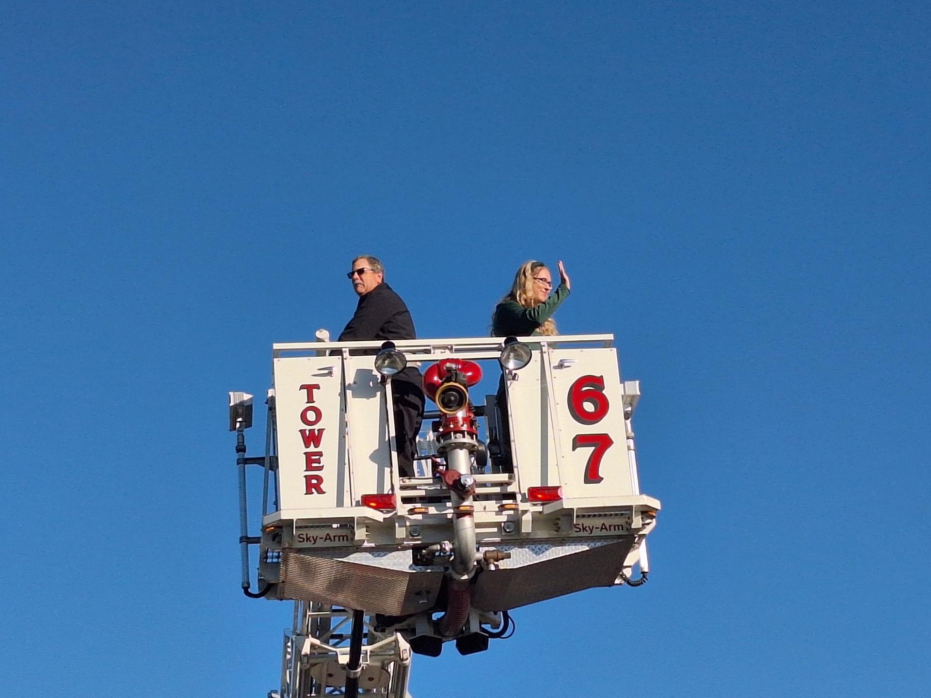 The firefighters presented a great presentation about fire alarms, the proper way to call 911, and what a firefighter looks like in full gear. Students had the opportunity to explore the fire trucks, and Ms. Sietz even got to take a ride in the lift, bringing plenty of giggles from the students!